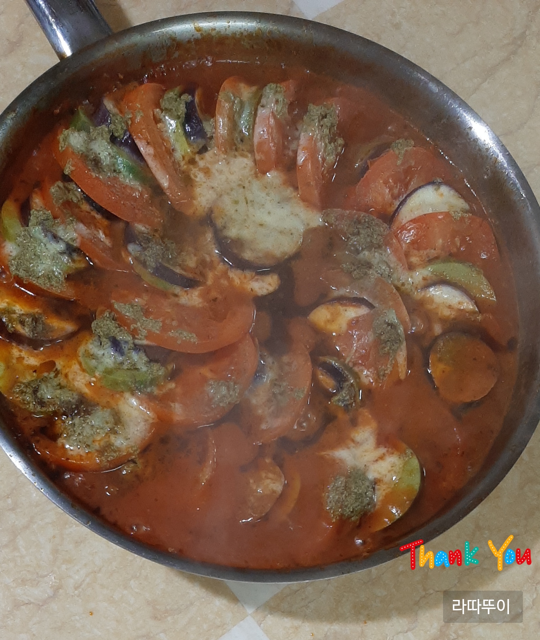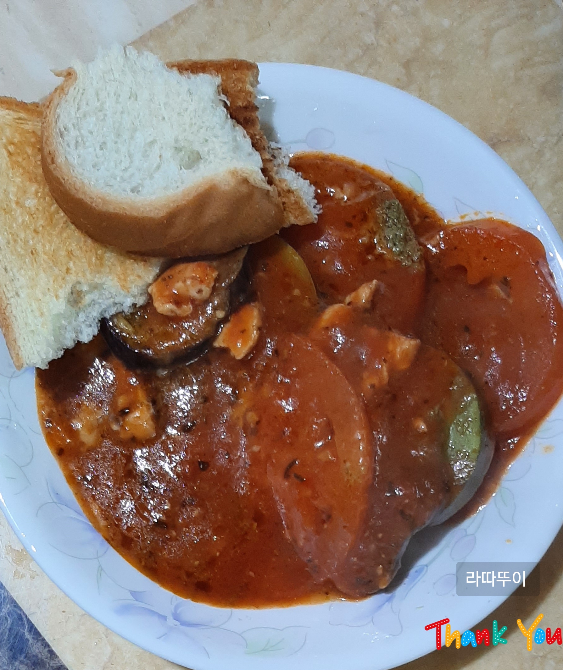 두 가지 음식이 한번에 완성되지 않아서 먼저 비빔칼국수를 먹고 라따뚜이를 먹었다. 토마토, 호박, 가지, 닭고기 등의 신선한 재료로 만들어서 어딘가에서 파는 맛이다.