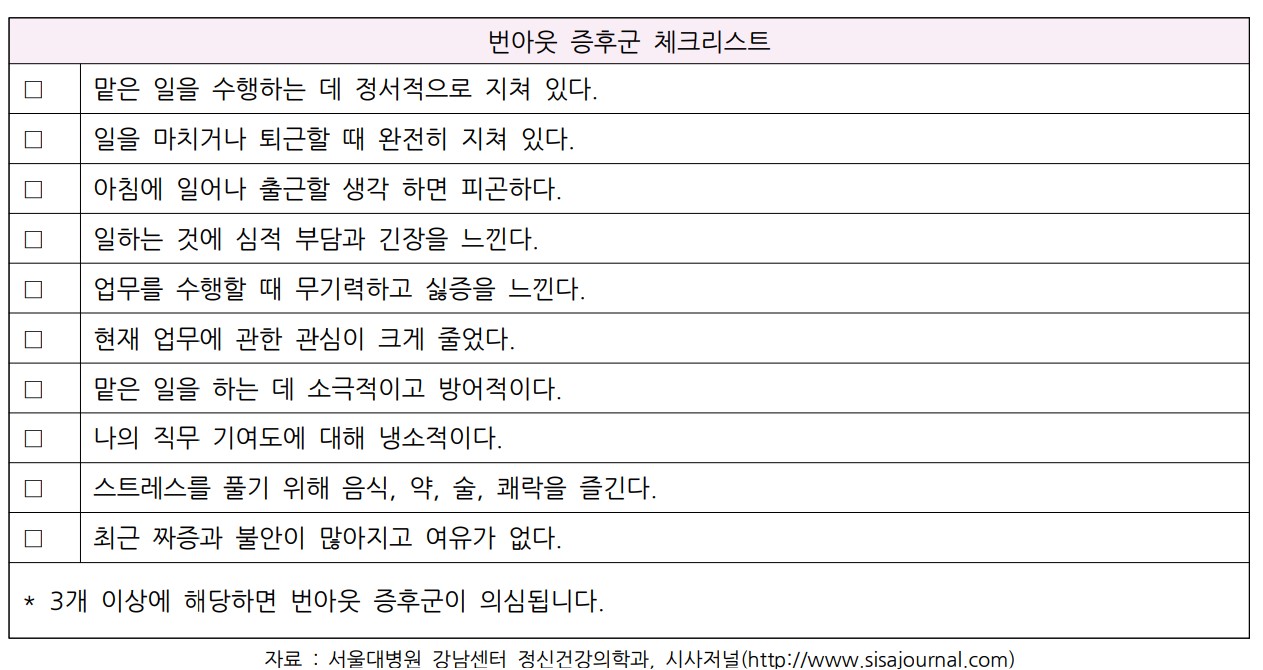 세계보건기구(WHO)는 번 아웃(BURN OUT)을 “제대로 관리되지 않은 만성적 직장 스트레스에서 오는 증후군”이라고 정의한다. 의학적으로 질병은 아니지만 제대로 알고 관리해야 하는 직업 관련 증상 중 하나라고 인정한 것이다. 방치할 경우 일이나 삶에 대한 의욕이 사라지는 정도를 넘어 우울증, 불면증, 불안, 공포, 공황장애, 심장병, 고혈압, 당뇨 등 건강 문제로 발전한다.(출처 : 시사저널(http://www.sisajournal.com)