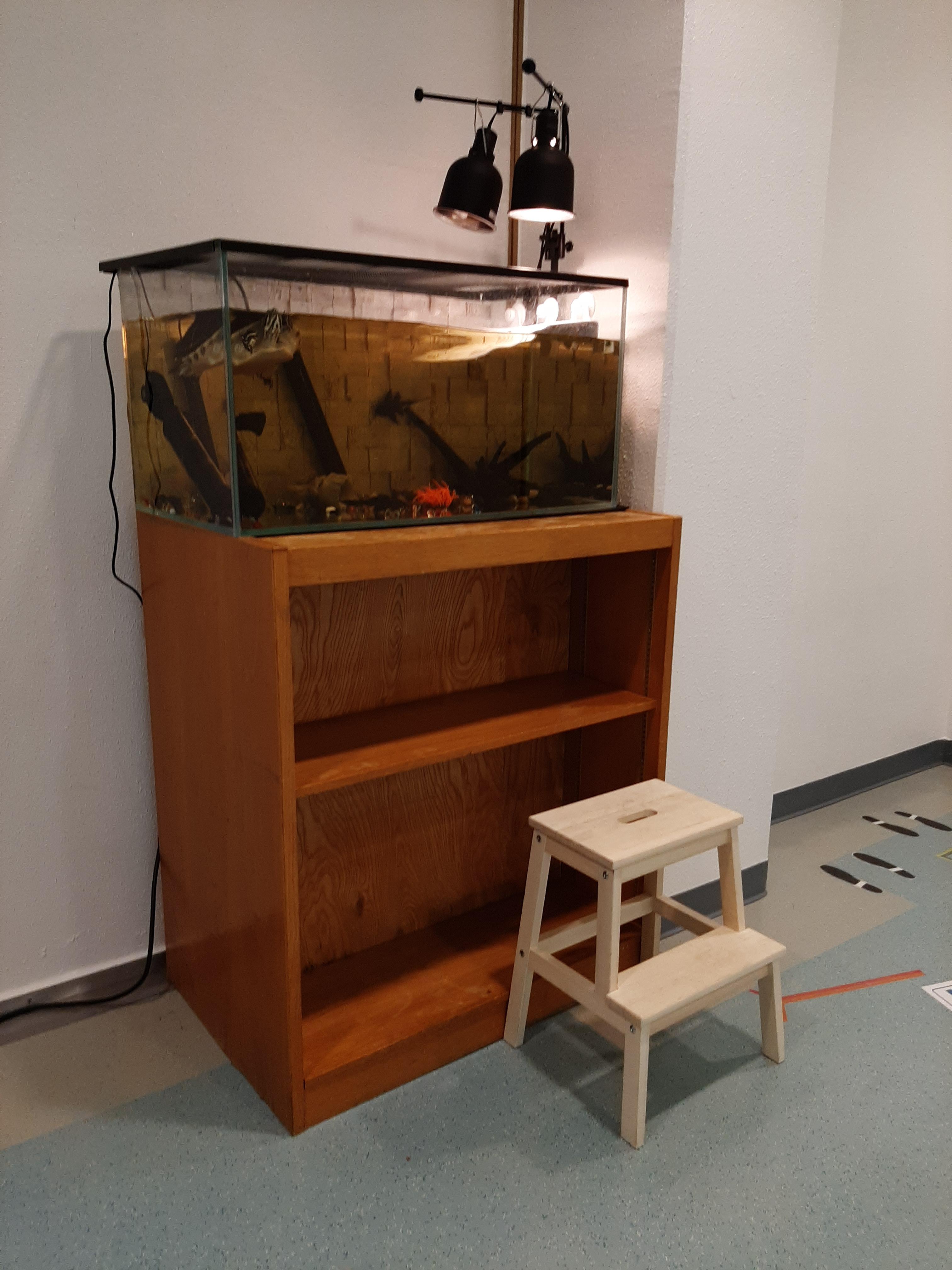 복도의 끝에 어항이 있다. 어항 안에 상어와 거북이가 있다. 상어는 벽에 붙어있다. 키 작은 아이를 위해 발판을 마련해 두었다.